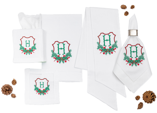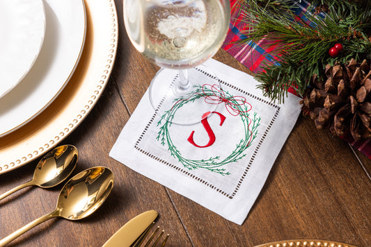 Christmas Embroidered Linen Cocktail Napkins with Wreath Monogram | Christmas Gift and Holiday Decor