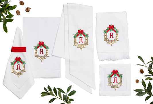 Embroidered Christmas Cocktail Napkins with Chinoiserie Frame and Personalized Single Letter Monogram Set