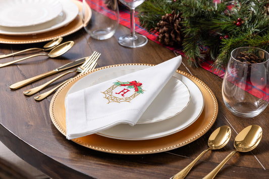 Embroidered Christmas Dinner Napkins with Chinoiserie Frame and Personalized Single Letter Monogram