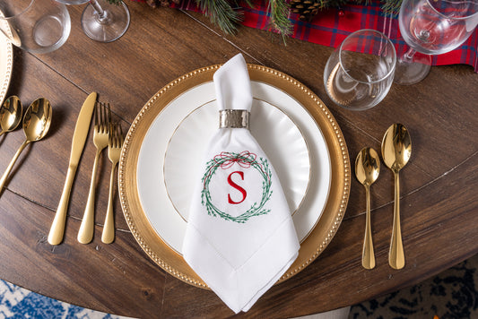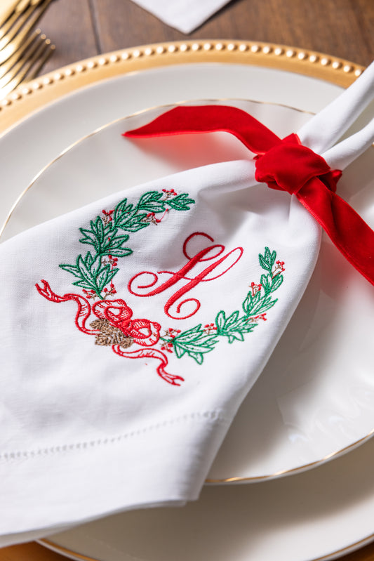 Christmas Embroidered Dinner Napkins Napkins Thin Bow Wreath and Personalized Single Letter Monogram