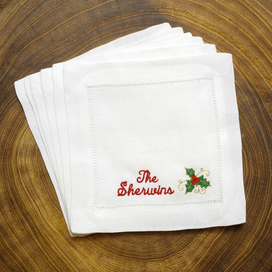 Christmas Embroidered Cocktail Napkins with Minimalist Script Name and Mistletoe