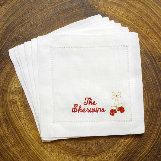 Christmas Embroidered Cocktail Napkins with Minimalist Script Name and Mittens