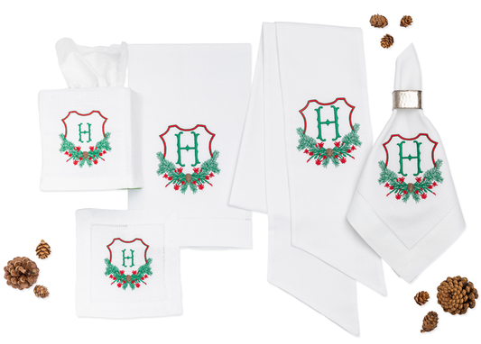 • embroidered christmas white linen napkins with red ribbon
