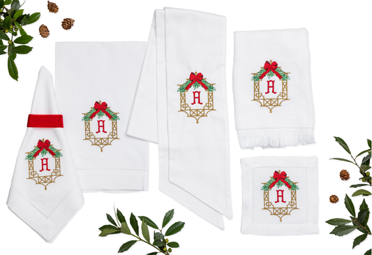 • Christmas Embroidered White Fingertip Hand Towel with Chinoiserie Frame